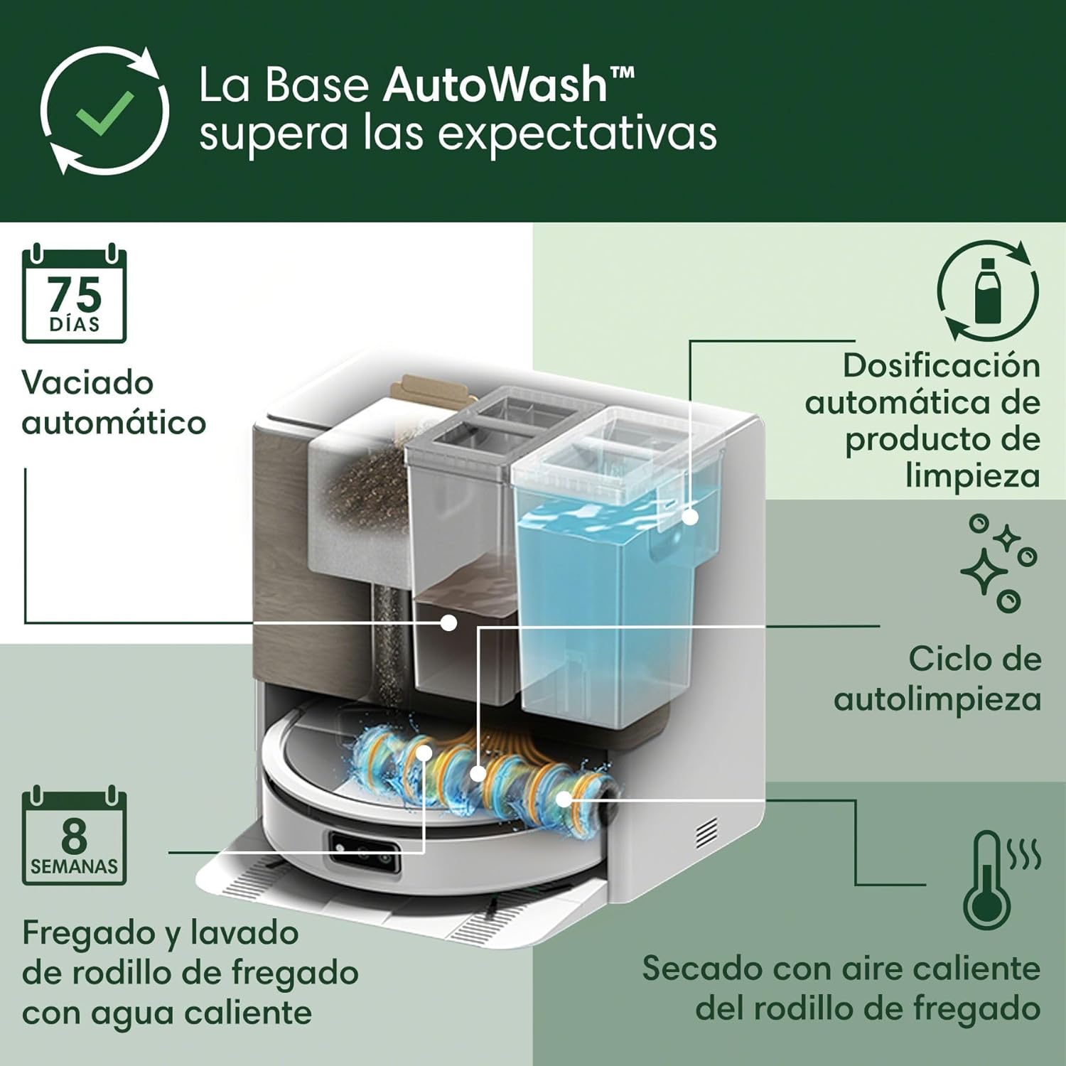 8 semanas de fregado y limpieza automática del rodillo con agua caliente*.